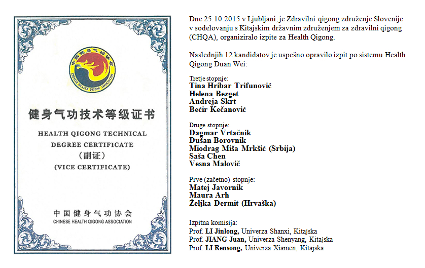 Health qigong seminar LZJ s kitajskimi profesorji (2. dan) Ljubljana, Litostrojska cesta 51, Srednja šola tehniških strok Šiška Duanwei izpit od CHQA |